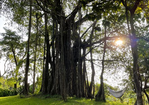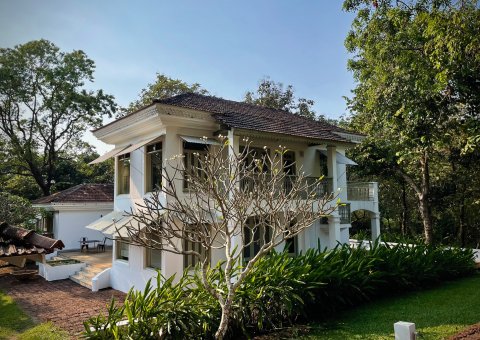 Das Ayurveda Resort liegt abseits der Küste, in Old Goa – umgeben von Reservatswäldern und weiten Ausblicken auf Hügel und das Mandovi-Delta. Es ist still hier, naturnah und ohne touristische Geschäftigkeit. Mit nur sechs Zimmern bleibt das Haus klein und persönlich: Die Mandovi Rooms öffnen sich zu Balkonen mit Blick auf Wasser und Waldlandschaft, die Banyan Rooms führen direkt in den Garten, wo der 300 Jahre alte Banyanbaum steht. Die Lage ist kein Zufall – sie schafft Distanz zum Alltag und ermöglicht den Rückzug, den eine Ayurveda-Kur braucht, um ihre Wirkung zu entfalten.